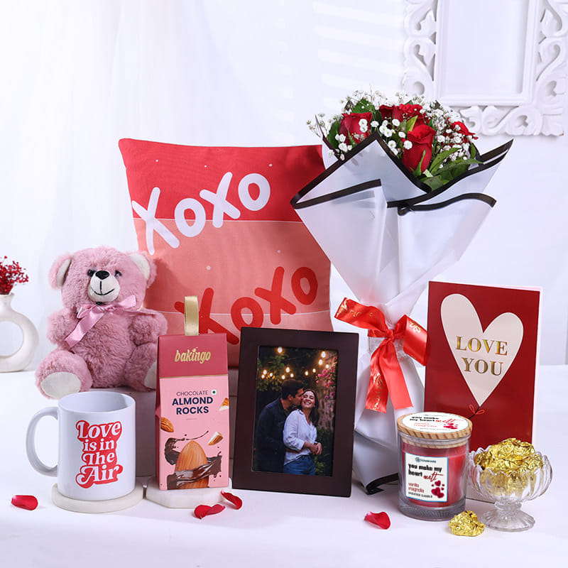 This romantic hamper is the ultimate expression of love and thoughtfulness. Featuring a charming printed cushion with a playful 'XOXO' design, a personalised white ceramic mug with a heartfelt message, and a soft purple teddy bear for cuddles, this gift is sure to make your loved one smile. The A5 photo frame adds a personal touch, while the exquisite Bakingo Choco Almond Rocks, a fragrant Vanilla Magnolia scented candle, and a stunning red rose complete this Valentine gift set. Wrapped in premium packaging, this hamper is the perfect way to show how much you care.