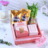 A touch of calm, a hint of sweetness, and a little good luck come together in this thoughtfully curated hamper. The fresh bamboo plant adds a sense of positivity, while the rose and black oud candle fills any room with a warm, soothing fragrance. Almond cookies bring a delicious crunch, and the chocolate treats add a cheerful finish. Arranged beautifully in a pastel open tray with a petite glass vase, this set feels elegant, comforting, and perfect for gifting on New Year or any special day.