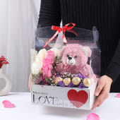 A perfect blend of sweetness and affection, this gift is sure to brighten anyone's day. Featuring a soft purple teddy bear, pink roses, white roses, and vibrant purple daisies, it’s a charming way to express love. Ferrero Rocher chocolates offer a touch of indulgence, while delicate fillers complete the romantic arrangement. Presented in a box with the message "This is What Love Looks Like," this thoughtful Valentine special gift is the ideal gesture to show someone just how much they are cherished.