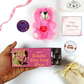 Delight your sister with this Bhai Dooj gift set that blends sweetness and charm. A plush pink teddy clutching a “Best Wishes” heart brings warmth and cheer, while the elegant potli adds a festive, traditional touch. The highlight is the chocolate bar, wrapped in celebratory Bhai Dooj packaging, offering a delicious taste that makes every bite unforgettable. Perfectly balancing cute appeal and indulgence, this set carries the spirit of the occasion with thoughtfulness. It’s more than a gift—it’s a heartfelt way to show love, appreciation, and joy on this special day.