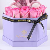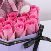This enchanting gift features a soft purple teddy nestled among fresh pink roses, elegantly arranged in a beautiful purple hexagon box. The delicate blooms and cuddly teddy create a perfect blend of love and warmth, making it an ideal gesture for Valentine's Day or any romantic occasion. Its thoughtful combination of affection and beauty speaks volumes, offering a heartfelt surprise that will make your loved one feel cherished and adored. A timeless expression of love, this arrangement is sure to captivate the heart of anyone special.