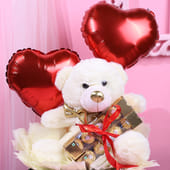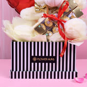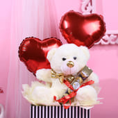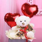 Indulge your loved one with this heartfelt gift hamper, beautifully presented in a sleek black and white striped box. Inside, they’ll find a cuddly white teddy bear, perfect for snuggling, accompanied by a festive heart-shaped foil balloon that adds a touch of romance. The hamper also includes a box of Ferrero Rocher chocolates, offering a moment of sweet delight. Wrapped in a soft non-woven sheet, this gift is the ultimate gesture for anniversaries, Valentine’s Day, or any romantic occasion, combining charm, sweetness, and love in one thoughtful package.