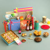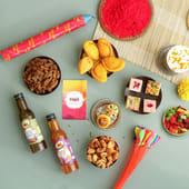 Indulge in the most extravagant Holi gift hamper, designed to bring joy and colour to your celebrations. This stunning jute basket holds an impressive assortment of traditional treats. Enjoy the creamy, melt-in-your-mouth Rangeela Kaju Katli, delicate rose Kaju fudge, aromatic Thandai Laddoos, and refreshing Paan Badam Laddoos. Paired with Kesar Shahi Gujiya, mixed nuts, berries, and the tangy kick of paan raisin. Complete with thandai, chandan sharbat, water balloons and colour bombs.