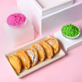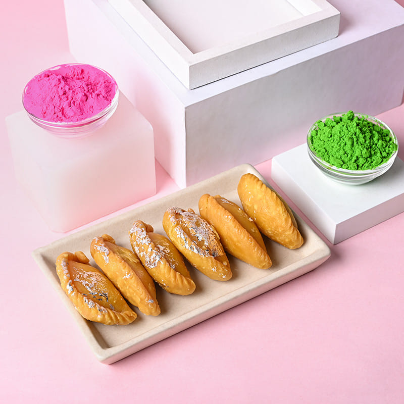 What are the two inseparable elements of Holi? Apart from the fun and happiness, Gulaal and the traditional sweet dish Gujiya are what Holi brings to our life. Get home or gift loved ones a combo of pink and green Holi Gulaal and a box of sweet, delicious Gujiyas.
