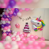 Elevate any birthday celebration with this exquisite balloon decoration package, meticulously crafted by expert decorators at your home or chosen location. It includes 40 balloons in soft shades of pink, white, and purple, each delicately attached to the ceiling with elegant ribbons. Create a captivating atmosphere with an impressive arc of 150 balloons of the same shades and shimmering metallic silver hues. The decoration is further enhanced with charming foil balloons: a festive cake, a fancy unicorn, and two radiant pink stars. A stylish silver 'Happy Birthday' bunting adds a touch of sophistication. To complete the magical ambience, 15 white and pink balloons gracefully adorn the floor, creating a memorable setting for the special day.