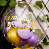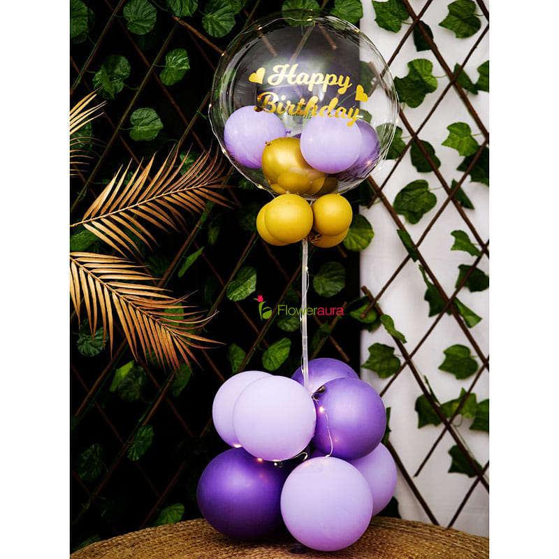 Surprise someone dear on his/her birthday with this balloon arrangement. It includes 1 Balloon stand, 1 Bubble balloon filled with two purple pastels, two purple chrome and one golden chrome ballon, 1 Customisable golden vinyl message, 1 Golden chrome, 4 Purple pastel balloons, 4 Purple chrome balloons, and 1 Battery light