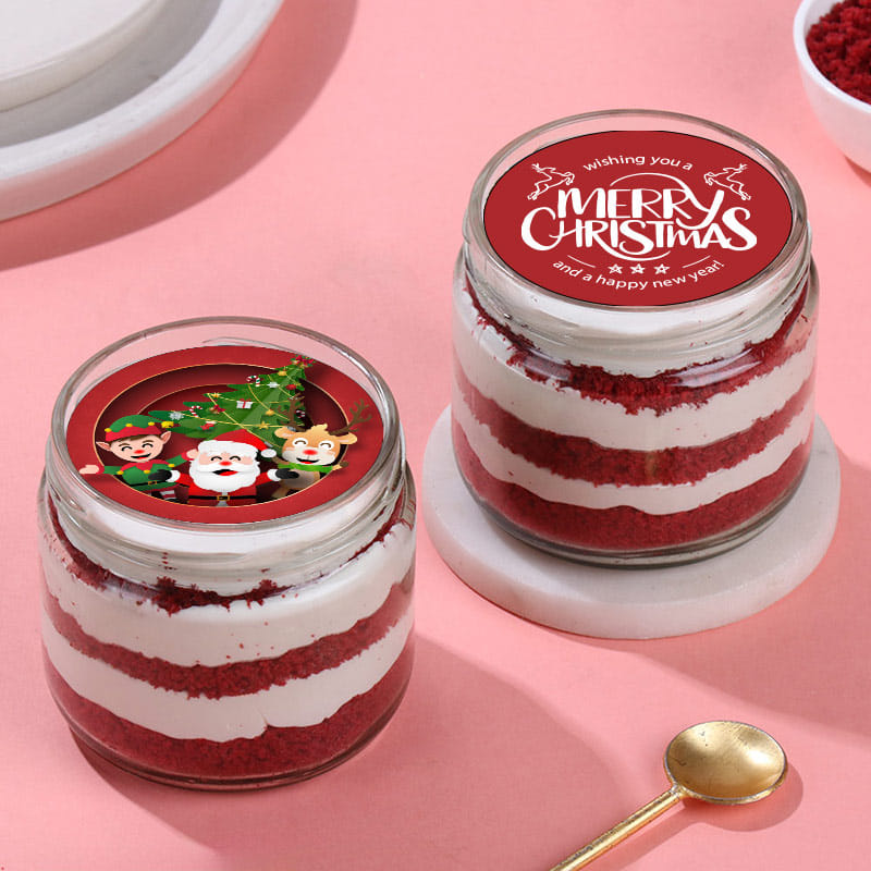 Make this Christmas extra special with our delightful Pair of Red Velvet Jar Cakes. These aren't just any cakes; they're festive photo cakes adorned with Santa and Merry Christmas themes. Each jar is a delectable masterpiece, brimming with the rich, velvety goodness of red velvet cake and layers of creamy frosting. These jar cakes not only taste heavenly but also capture the joy and spirit of the season through their charming designs. Whether it's a gift for a loved one or a treat for yourself, these Red Velvet Jar Cakes are the perfect way to savor the sweetness of Christmas.