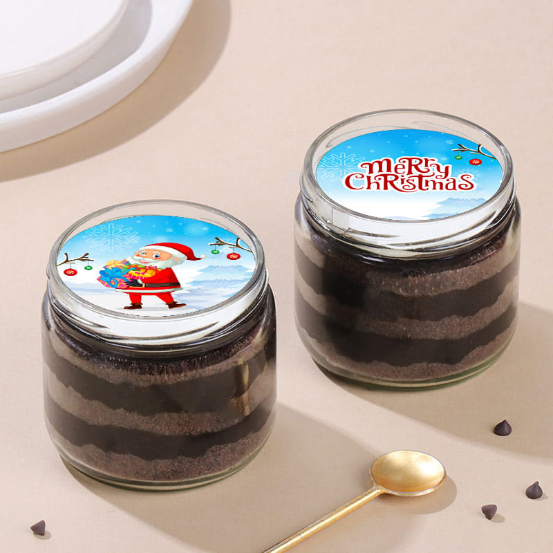 Indulge in the magic of Christmas with this delectable chocolate flavored poster jar cake duo. This delightful pair of jar cakes is a feast for both the eyes and taste buds. Adorned with charming Christmas-themed posters, one features Santa, while the other radiates "Merry Christmas" joy. Crafted with the finest, freshest ingredients, these cakes boast a rich chocolate flavor that's simply irresistible. Share the merry Christmas spirit at your feast table or gift them to loved ones. Embrace quality, flavor, and festive cheer with every delicious bite - the perfect treat for this joyful season.