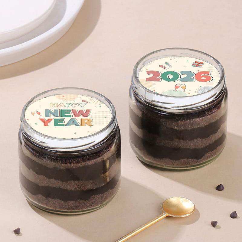 Celebrate the arrival of the New Year with these exquisite chocolate jar cakes, a perfect blend of taste and elegance. One jar is gracefully topped with a fondant sheet proudly displaying '2026', symbolizing the hopeful journey into the new year. The other jar complements it with a sheet that reads 'Happy New Year', capturing the joy and excitement of new beginnings. These cakes are not just desserts but artistic representations of the festive spirit. Each bite of the rich, moist chocolate cake offers a delightful experience, making them ideal for welcoming the year with sweetness and joy.