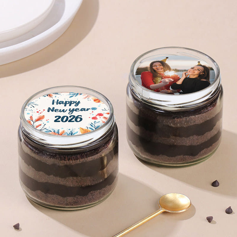Raise a sweet toast to the New Year with these delightful jar cakes! Featuring layers of moist chocolate cake and delicious cream, each bite promises an unforgettable taste experience. That's not all! One jar is personalised with a 'Happy New Year 2026' design and the recipient's name, while the other showcases a cherished photo, adding a heartfelt and personal touch to the festivities. Perfect for gifting or indulging yourself, these jar cakes bring an extra dose of sweetness and warmth to every New Year celebration.