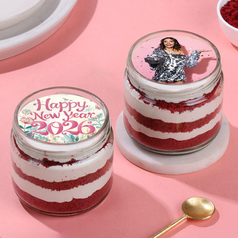 Celebrate the New Year with a dash of sweetness with these two jar cakes—a visual and flavourful delight! Each jar features layers of rich red velvet cake and delicious frosting, creating a decadent treat that melts in your mouth. One jar boasts a vibrant 'Happy New Year 2026' message and can be personalised with the recipient's name, while the other showcases a cherished photo of your choice. These jar cakes blend festive vibes with heartfelt personalisation, making them the perfect gift to spread joy and love among your dear ones this New Year.