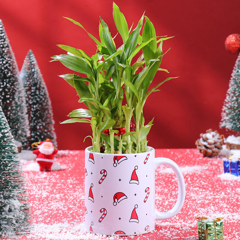 Celebrate Christmas memorably with this festive Mug. The white ceramic coffee mug, decorated with charming Santa hats and candy canes, holds a fresh bamboo plant that adds a touch of green calm to any space.
