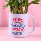 Celebrate empowerment with this unique and thoughtful gift! The printed mug, featuring the inspiring quote "Behind Every Successful Woman is Herself," is potted with a beautiful bamboo plant. This combination of motivation and nature adds a touch of positivity and growth to any space. The mug, designed to uplift and inspire, makes for a perfect gift for occasions like Women’s Day or just to surprise women who are making strides in their journey. A meaningful addition to any desk or home, this piece promotes both success and serenity.