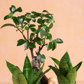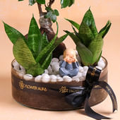 This lush arrangement brings nature’s calm into any space. Featuring a graceful Bonsai plant and two Snake plants nestled in a clear vase, it’s truly a sight to behold. The leafy companions are complemented by a peaceful monk figurine, while the white pebbles add a modern touch, enhancing the overall visuals. Perfect for creating a relaxing atmosphere at home or as a thoughtful gift, this piece serves as a beautiful reminder of balance and inner peace. Whether for a loved one or yourself, it’s a delightful way to infuse any room with a touch of zen.
