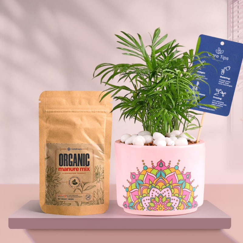 Infuse your space with cultural elegance and natural freshness with the FlowerAura Bamboo Palm (Chamaedorea), beautifully placed in a handcrafted Pink Rangoli Terracotta Pot. Celebrated for its graceful, arching fronds and air-purifying capabilities, this indoor plant brings tranquility, wellness, and visual charm into any room. The pink terracotta pot, adorned with intricate rangoli-inspired patterns, adds a traditional yet vibrant flair. Complete with organic manure for healthy growth, it’s a meaningful gift or stylish addition to your décor.