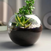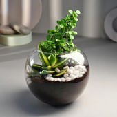 Bring natural elegance indoors with this Jade and Milt Terrarium, beautifully set in a round fishbowl glass vase. The lush Jade plant symbolises prosperity and endurance, while the Milt offers air-purifying freshness and striking contrast with its variegated leaves. Nestled in rich soil and accented with smooth white pebbles, this indoor terrarium plant is a perfect blend of minimalism and tranquillity—an effortless way to refresh desks, corners, or coffee tables with vibrant greenery and good vibes.