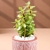 Elevate your home decor with this enchanting jade plant, snugly housed in a terracotta pot adorned with graceful white leaf motifs. This botanical masterpiece not only adds a touch of natural charm but also infuses your space with tranquillity and positivity. The jade plant thrives with vibrant greenery, a testament to its remarkable quality and the care it receives. It effortlessly becomes a stylish centerpiece, radiating a sense of serenity and well-being throughout your home, making it the perfect addition to your living space.