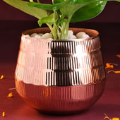 A Money Plant in a stunning Rose Gold Metal Pot creates a perfect harmony of nature and elegance. The lush green leaves of the Money Plant thrive in this modern pot, bringing both life and style into any space. The beautiful rose gold pot complements the vibrant plant, making it a thoughtful gift or an ideal addition to your home decor. Its low-maintenance nature adds to its charm, allowing it to thrive in any environment with minimal effort.