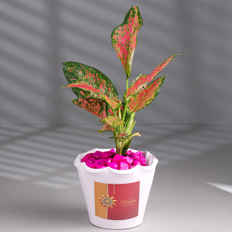A living symbol of care, the Pink Aglaonema blooms with shades of lush green and tender pink, echoing the warmth of sibling affection. It's a white pot, sculpted with soft wave-like curves, that holds vivid pink stones that mirror the playful spirit of childhood memories. A festive sticker adorns the pot, featuring a golden Rakhi and the words "Happy Raksha Bandhan," evoking a promise of eternal protection and love. Like a Rakhi tied with devotion, this plant grows with every passing day, embodying the unbreakable bond of siblings, nurturing trust, joy and harmony in every leaf.