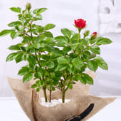 A blooming rose plant wrapped in natural jute creates a gift that feels earthy, warm, and thoughtfully styled. Set in a nursery pot and finished with soft pebbles, the plant carries a gentle charm that blends rustic beauty with everyday elegance. A neatly tied ribbon holds the jute wrap in place, adding a subtle finishing touch without taking away from the rose itself. Ideal for desks, windowsills, or cosy corners. Perfect for Valentine’s Day, anniversaries, or moments when words feel insufficient, it offers a lasting reminder that meaningful gestures need not be loud to be deeply felt.