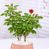 A graceful rose plant finds its place in a rose gold metal pot, creating a gift that feels thoughtful, lasting, and full of warmth. Delicate blooms rise gently from a bed of soft pebbles, adding balance, beauty, and a calm sense of care. The metallic sheen of the pot brings a modern charm, while the rose plant carries timeless emotion, making this piece perfect for meaningful gifting. Ideal for birthdays, anniversaries, housewarmings, or simply to say you’re thinking of someone, this living gift grows with time and quietly brightens every corner it’s placed in.