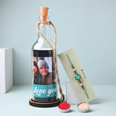 This Raksha Bandhan, convey your affection and admiration for your brother with this extraordinary Rakhi combo. Embrace the charm of a modish blue-hued Rakhi adorned with an exquisite centre dial, various beads and metal accents, symbolizing the timeless bond you both share. Alongside the Rakhi, this combo presents a versatile hanging+table top showpiece—an enchanting bottle lamp that can be personalized with cherished pictures, illuminating your brother's life with fond memories. This thoughtful gesture will surely warm his heart and serve as a constant reminder of your love, making this Rakhi an unforgettable celebration of sibling love and togetherness.