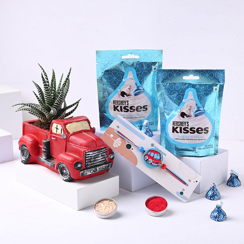 Ignite the spirit of Raksha Bandhan with this extraordinary combo! As the festival of love and protection approaches, surprise your sibling with a unique gift selection. The combo includes a vibrant Haworthia Plant gracefully placed in a quirky red truck pot, symbolizing growth and prosperity for your sibling's life. The Designer Car Rakhi adds a dash of creativity to the traditional thread, making it an eye-catching accessory for your brother. To make the celebration even sweeter, we've included a pack of two Hershey's chocolates for indulgence. This thoughtful and creative combo is a perfect way to cherish your sibling's love and create unforgettable memories this Raksha Bandhan.