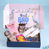 Celebrate the festival of love and protection with the thoughtfully curated FlowerAura Premium Raksha Bandhan Hamper. This special gift box includes a beautiful Designer Mandala Rakhi, symbolizing balance, protection, and spiritual harmony. To treat your brother, bhai, or cousin, the hamper features BBQ-flavored Almonds—a bold and crunchy snack—and a Set of 2 Max Protein Bars in Chocolate flavor, perfect for fitness enthusiasts. The ritual essentials of Roli Chawal and a heartfelt Rakhi Greeting Card complete the festive experience. Elegant, healthy, and deeply meaningful—this hamper is a perfect Rakhi surprise packed with love and tradition.