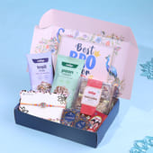 Celebrate the sacred thread of love and protection with the FlowerAura Premium Raksha Bandhan Hamper, designed to blend tradition with thoughtful indulgence. This beautifully curated gift box features a Designer Mandala Rakhi, symbolizing harmony and spiritual balance, ideal for your Brother, Bhaiya, or Cousin. To add a delicious twist, it includes a nourishing Trail Mix, flavorful Paan Raisins, and rich, flaky Baklawa Tarts—a royal dessert that elevates the celebration. With Roli Chawal for rituals and a heartfelt Rakhi Card to express your emotions, this hamper is the perfect blend of tradition, taste, and love.