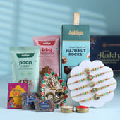 Celebrate the timeless bond of love and protection with the FlowerAura Premium Raksha Bandhan Hamper, a thoughtfully curated gift to make your brother feel truly special. This elegant box includes a Set of 5 intricately designed Rakhis, luxurious Hazelnut Rocks, flavorful BBQ Almonds, and traditional Paan-flavored Raisins—a blend of taste and sentiment. A beautifully adorned Tikka Thali, Roli Chawal, and a heartfelt Rakhi Card complete the festive feel, making it perfect for your Brother, Bhaiya, Cousin, or Bhai. Packaged with love, it’s not just a gift but a memory in the making.