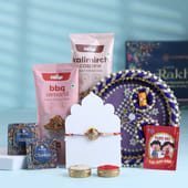 Make this Raksha Bandhan truly unforgettable with the FlowerAura Premium Raksha Bandhan Hamper, crafted to express love, protection, and appreciation. This elegant gift box features a stunning Designer Peacock Rakhi, symbolizing beauty and strength, paired with gourmet treats like BBQ Almonds and flavorful Kalimirch Cashews. It also includes a beautifully decorated Tikka Thali, traditional Roli Chawal, and a heartfelt Rakhi Greeting Card—everything needed to honor cherished sibling bonds. Thoughtfully packaged, this hamper is ideal for your Brother, Bhai, Bhaiya, or Cousin, making the celebration joyful and full of warmth.