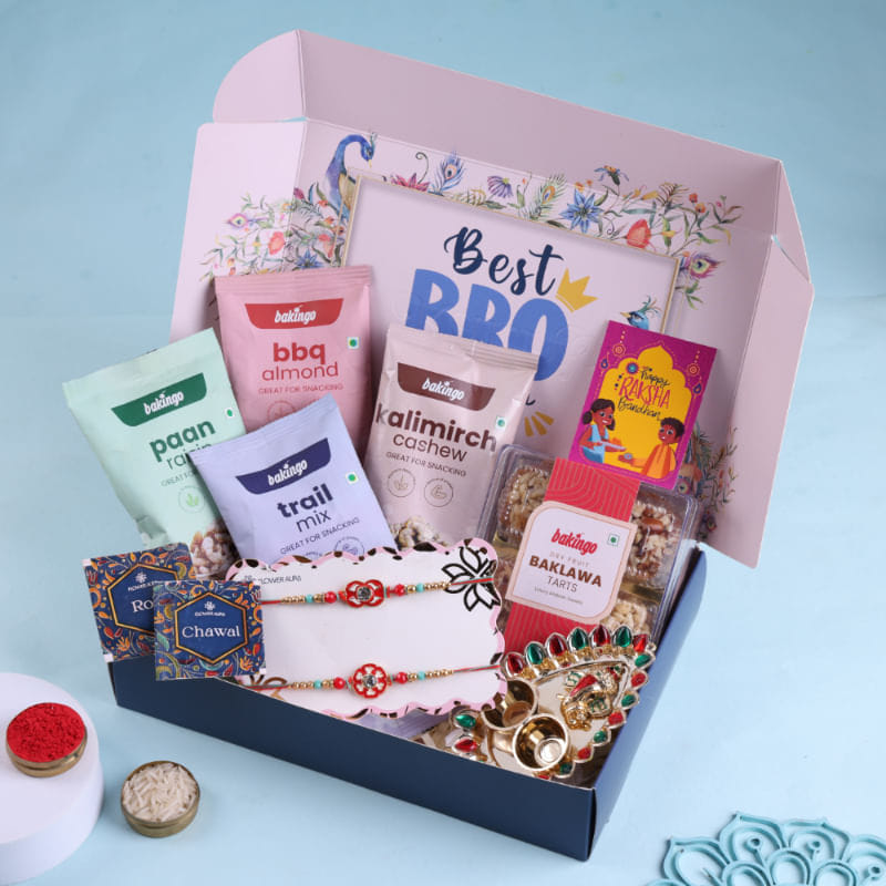Celebrate the eternal bond of sibling love with the FlowerAura Premium Raksha Bandhan Hamper, thoughtfully curated to delight your brother or cousin on this special day. This luxurious gift box includes a beautiful set of 2 designer Rakhis, exotic Baklawa Tarts, crunchy BBQ Almonds, zesty Kalimirch Cashews, flavorful Paan Raisins, and a healthy Trail Mix—a perfect mix of traditional charm and modern flavors. Completing the hamper is a decorative Tikka Thali, sacred Roli Chawal, and a heartfelt Rakhi Card to convey your emotions. Perfectly packed for your Brother, Bhai, or Cousin, it’s a gift of love, tradition, and delicious indulgence.