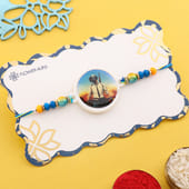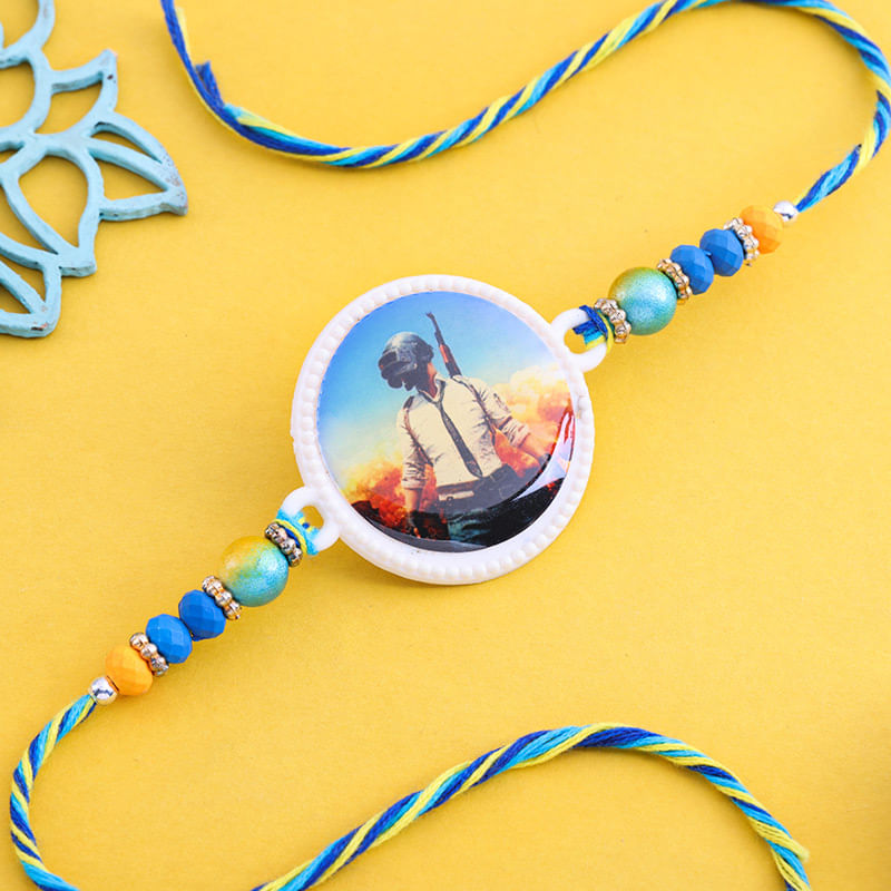 Adorn your brother's wrist with love and style this Raksha Bandhan with this captivating Rakhi. Embrace the essence of tradition and modernity with a quirky robot image imprinted on a metallic round base, beautifully adorned with red and purple beads. The vibrant purple and blue threads add a fusion touch, symbolizing the bond that blends the old and new. Delight your brother with this unique expression of affection, and let your Rakhi be a treasured reminder of your unbreakable sibling bond.
