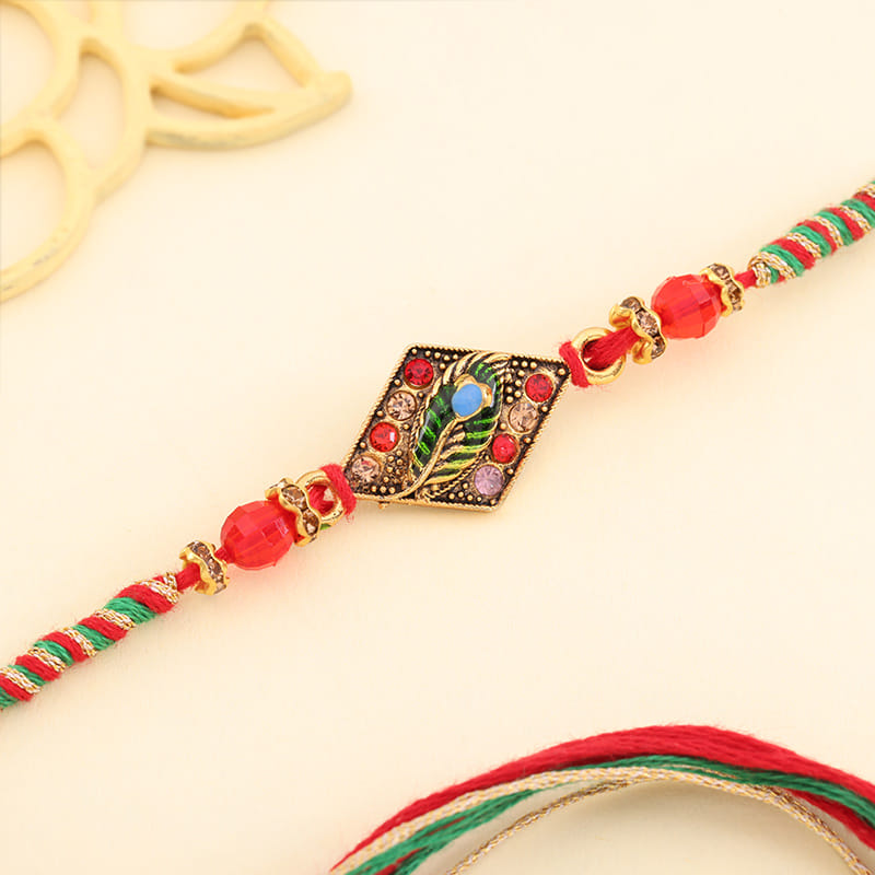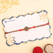 A playful twist on tradition, this vibrant Rakhi is a perfect mix of colour and character. Woven with eye-catching blue, green, and golden threads, it features bold red beads on both sides and a striking centrepiece that adds a touch of modern flair. The unique diamond-shaped design gives it a contemporary edge, while the vivid colour palette keeps the festive spirit alive. Ideal for a fun-loving brother who enjoys something different, this Rakhi is a cheerful reminder of your sibling bond—bright, bold, and full of heart.