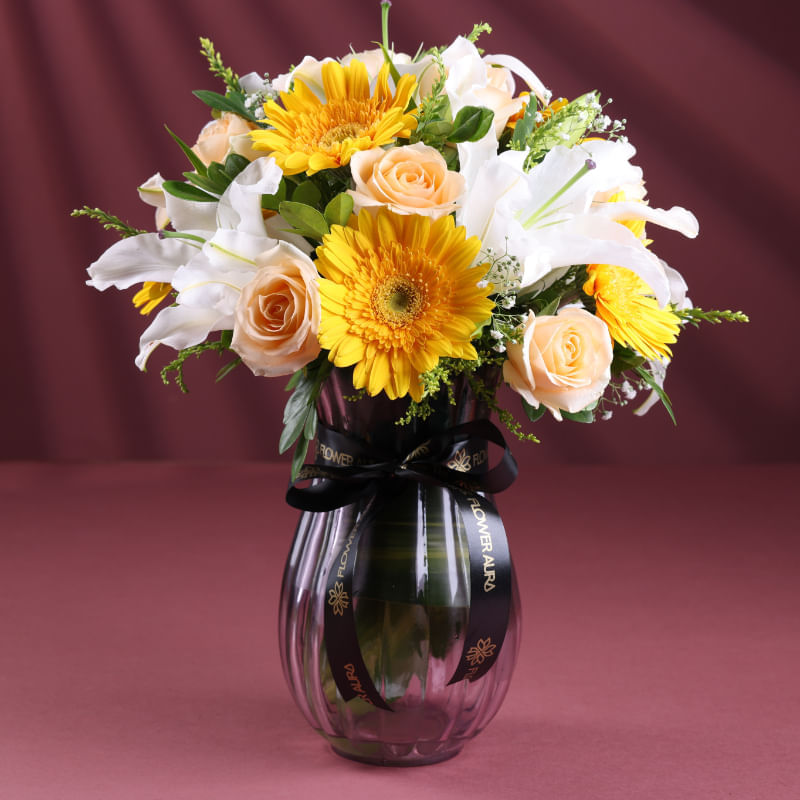 A soothing blend of warm yellows, soft peaches, and serene whites — this elegant vase arrangement radiates joy and calmness. The combination of gerberas, roses, and lilies makes it a thoughtful gift for any occasion, from congratulations to thank-you gestures. Price Breakup: Sunshine Gerberas N Peach Roses with White Lilies in Vase ₹1710, Glass Vase ₹150