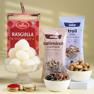 Divine Rakhi Duo With Snacks Hamper Rasgulla