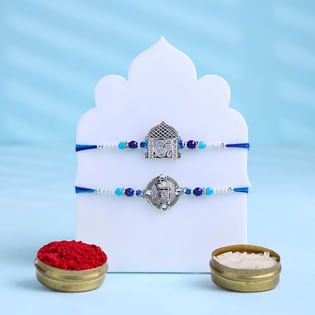• - Set of 2 Divine Rakhis with Silver Om & Temple Motifs