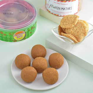 Set Of Five Rakhi Hamper With Panjiri Laddo N Dalmoth