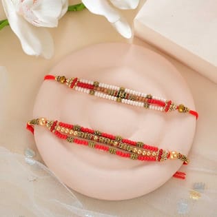 Beaded Rakhis With Chhappan Bhog Pista Rolls N Dalmoth