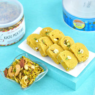 Set Of Two Rakhis With Pista Rolls N Namkeen