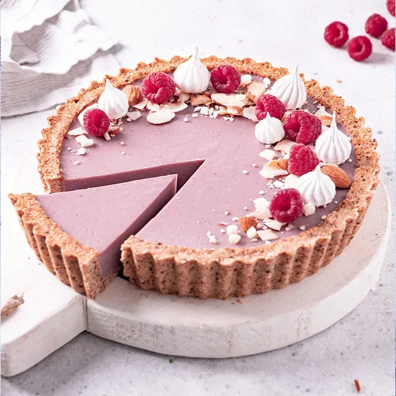 Indulge in the sweet-tart perfection of this raspberry tart cake. The smooth, creamy raspberry filling is perfectly balanced with the tangy freshness of ripe raspberries. Encased in a delicate, crumbly almond crust, it offers a satisfying bite that melts in your mouth. Topped with fluffy meringue kisses, crunchy almond slivers, and a burst of vibrant red raspberries, this tart cake is as visually stunning as it is delicious. A delightful treat for any occasion, it combines fruity sweetness with a touch of elegance and lightness.