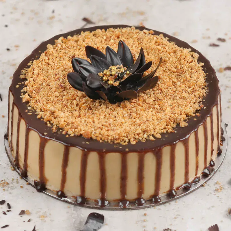 A cake that defines classic indulgence — this Butterscotch Cake is a perfect blend of crunch and cream. Layers of soft, fluffy sponge are infused with rich butterscotch flavour and covered in a silky caramel glaze. The crown of roasted nut praline adds a delightful crunch, beautifully contrasted by the smoothness of the cream. Finished with elegant chocolate garnish, this cake strikes the right balance between elegance and comfort. Whether for birthdays, anniversaries, or sweet cravings, every slice promises golden moments of joy.