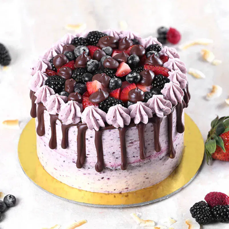 Treat yourself to this chocolate berry cake, a true indulgence. It is enveloped in a smooth layer of berry-infused buttercream, offering a perfect balance of tartness and sweetness. Each bite is a delightful mix of delicious chocolate ganache drips and the freshness of strawberries, blueberries, and blackberries on top. The delicate cream swirls make it a striking centrepiece for any occasion. Perfect for those who crave a refreshing yet indulgent dessert experience, this cake promises to elevate every celebration.