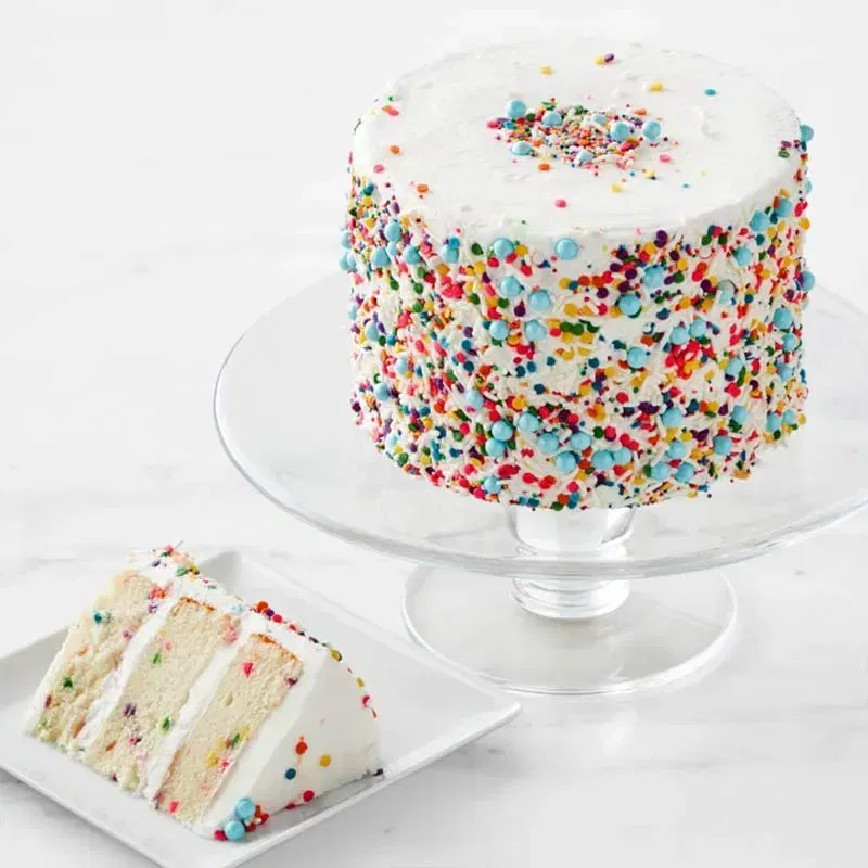 Turn any gathering into a colourful celebration with this classic vanilla cake. Soft layers, filled and frosted with smooth vanilla cream, create a light and fluffy indulgence that pleases every palate. What makes it party-perfect is its vibrant coating of sprinkles, covering the cake from top to sides, giving it a playful, festive charm. Every slice bursts with cheerful colour and classic vanilla taste, making it the star of birthdays, get-togethers, and joyous moments. Simple yet striking, this cake brings a sweet touch of happiness and fun to every table it graces.