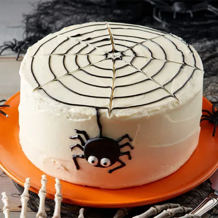 This chocolate cake is a delicious treat that’s perfect for Halloween or any fun occasion. The cake is intricately piped with dark chocolate to create a spider web design. A playful black spider with googly eyes adds a whimsical touch, making it a showstopper. The moist chocolate cake inside is rich and decadent, balanced by the creamy, sweet frosting. Every bite offers deliciousness, while the design makes it an irresistible centrepiece for your special occasion.