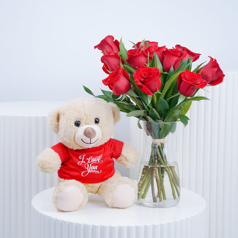 This beautiful arrangement of red roses, delicately arranged in an glass vase, is paired with a soft teddy bear, offering both elegance and affection. The red roses speak the language of love, while the teddy bear adds a personal touch, making it a perfect gift for any romantic occasion. Whether it’s for Valentine’s Day or simply to show someone you care, this charming gift is sure to make any moment even more special, creating lasting memories and heartfelt emotions.