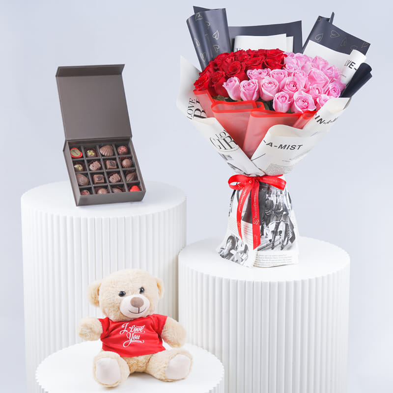 This luxurious bouquet of 51 roses features 26 pink and 25 red roses, wrapped in elegant white newsprint paper. The bouquet is accented with black and red heart-themed wrapping, tied together with a bold red ribbon. Along with the roses, a teddy bear and a 16-piece box of Sweecho "Queen of my Heart" chocolates complete this romantic gesture. Ideal for Valentine’s Day, anniversaries, or any special occasion, this combination of flowers, chocolates, and cuddles will make your loved one feel adored and cherished.