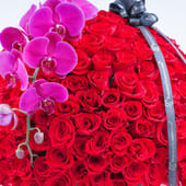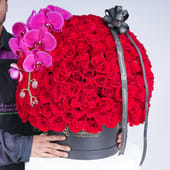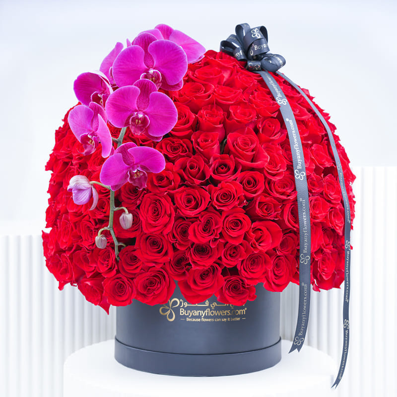 An extraordinary display of love, this arrangement showcases 251 vibrant red roses, beautifully complemented by a striking purple Phalaenopsis orchid. The flowers are elegantly arranged in a black round box, adorned with a black ribbon to enhance its beauty. This luxurious and sophisticated bouquet is perfect for special occasions like, Valentine’s Day, or any moment you want to make unforgettable. Its grandeur and elegance make it a memorable and romantic gift, bound to leave a lasting impact on anyone lucky enough to receive it.