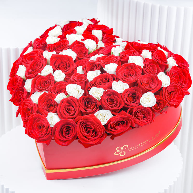 A gift that speaks from the heart, this exquisite arrangement of roses carries the essence of deep, unwavering love. The passionate red roses evoke timeless romance, while the delicate white roses add a layer of purity and grace. Nestled within a beautifully crafted red heart box, this stunning collection is a perfect representation of love's complexity. It's a gift that goes beyond words, offering a beautiful, lasting symbol of affection that will warm the heart of anyone who receives it.