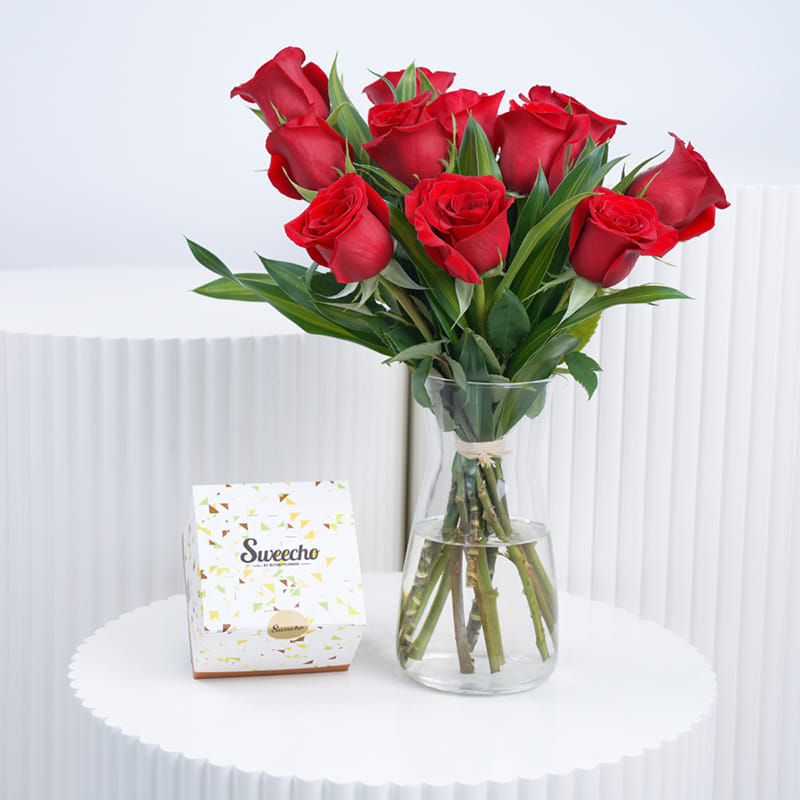 An exquisite bouquet of red roses, complemented by the fragrant Song of Jamaica leaves, is arranged with care in a sleek glass vase. Accompanied by a box of luxurious Sweecho chocolate, this gift embodies romance and elegance. Perfect for Valentine’s Day, anniversaries, or any heartfelt occasion, it’s an ideal choice for expressing love and affection. The combination of fresh flowers and indulgent chocolate creates a lasting impression, making this a memorable and thoughtful gesture for your loved one.